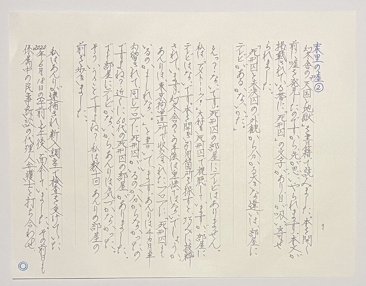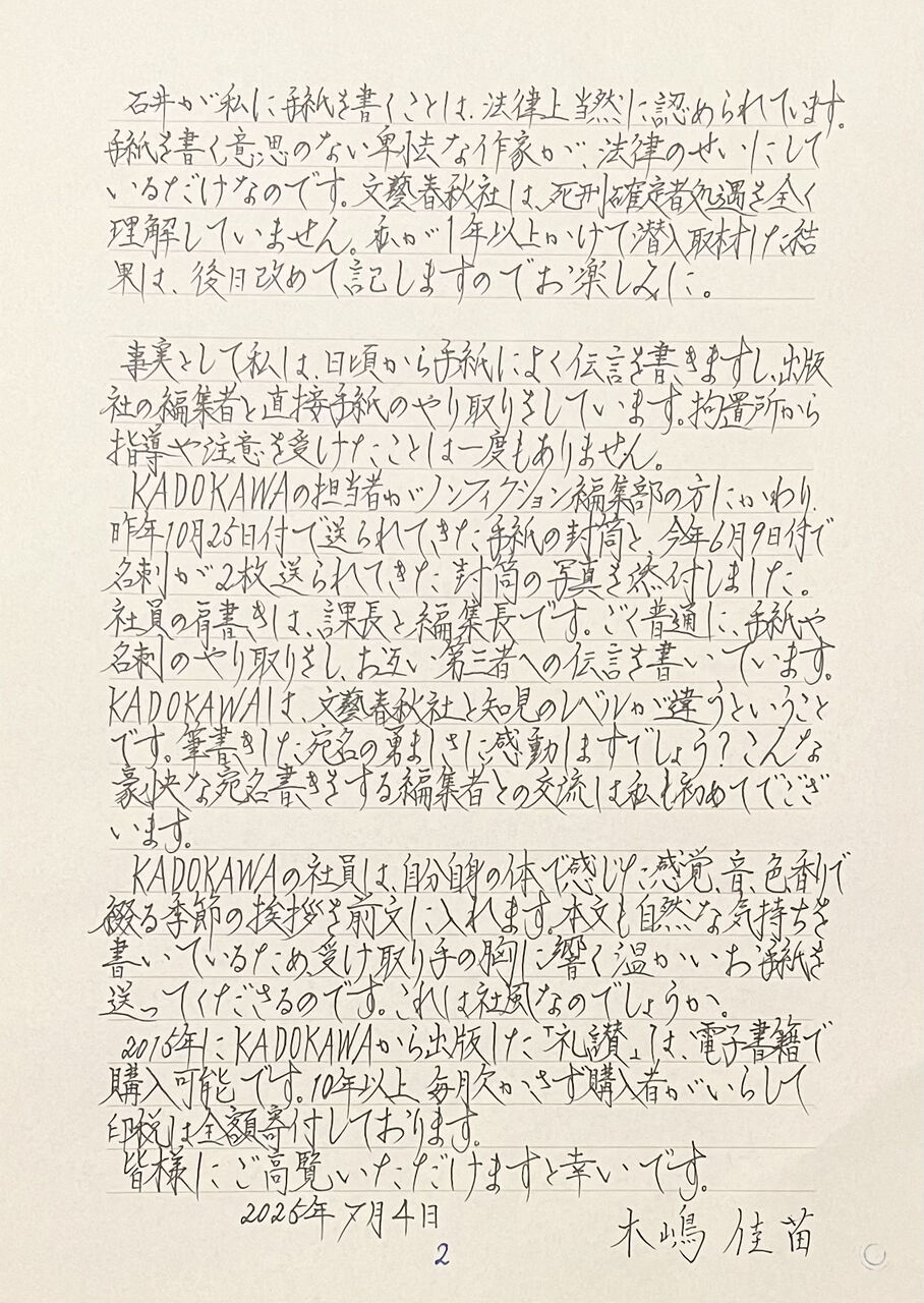 「創」編集長は、2025年7月14日発行の書籍の冒頭で「死刑確定者は基本的に家族と弁護士以外は接見禁止」と書きました。これは、虚偽です。「死刑確定時に今後特別に接見したい人を3人申請する仕組みがある」という記述も真っ赤な嘘。「死刑囚の獄中結婚では、1968年に連続射殺事件を起こした永山則夫元死刑囚のケースが知られている。彼が晩年まで作家としての活動を続けられたのは、獄中結婚した女性のサポートが大きかった」と明らかな虚偽も書かれています。