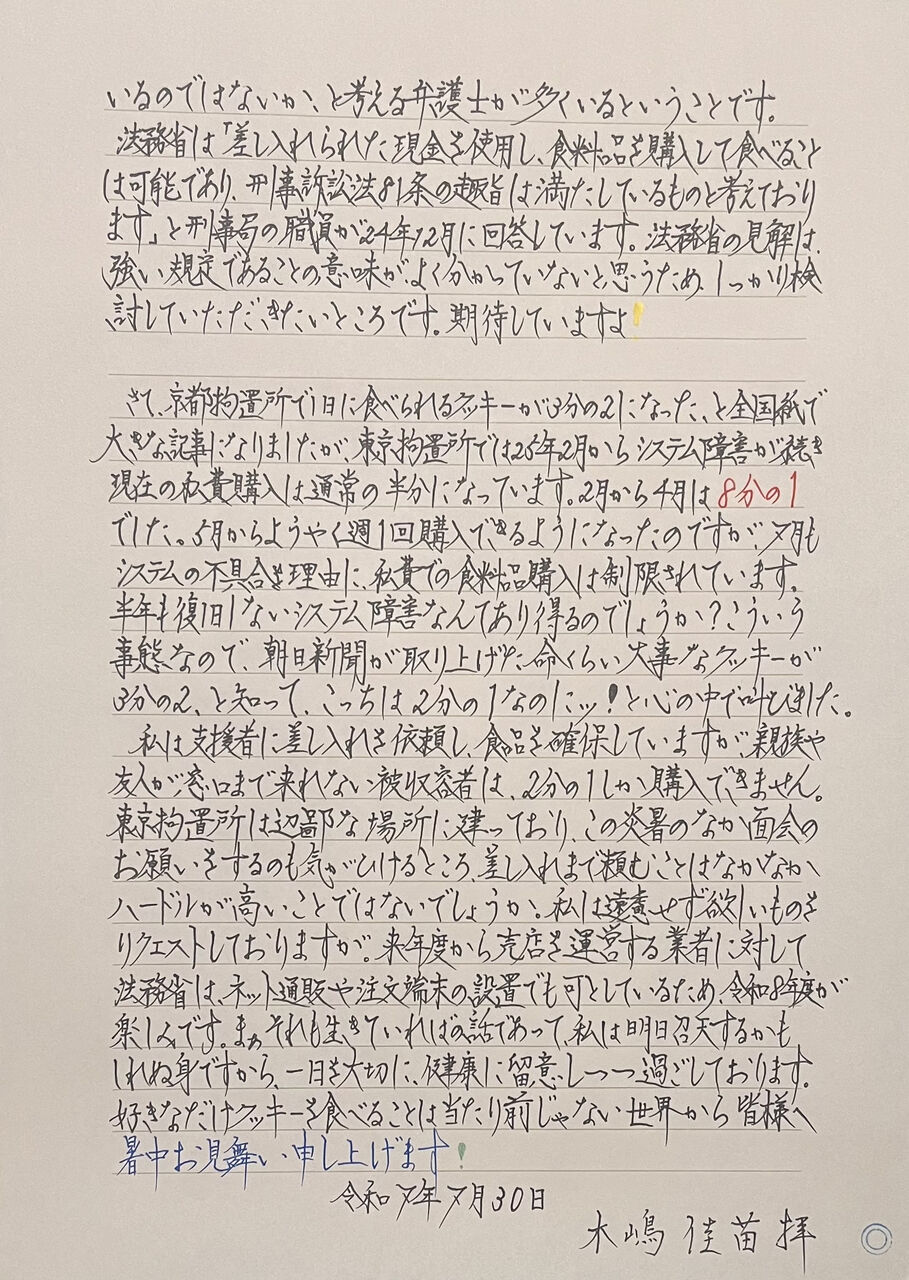 私の認識が間違っていたのか、東拘の運用が変わったのか判然としないのですが、確定後も外部交通権のない人からの差し入れが交付されています。