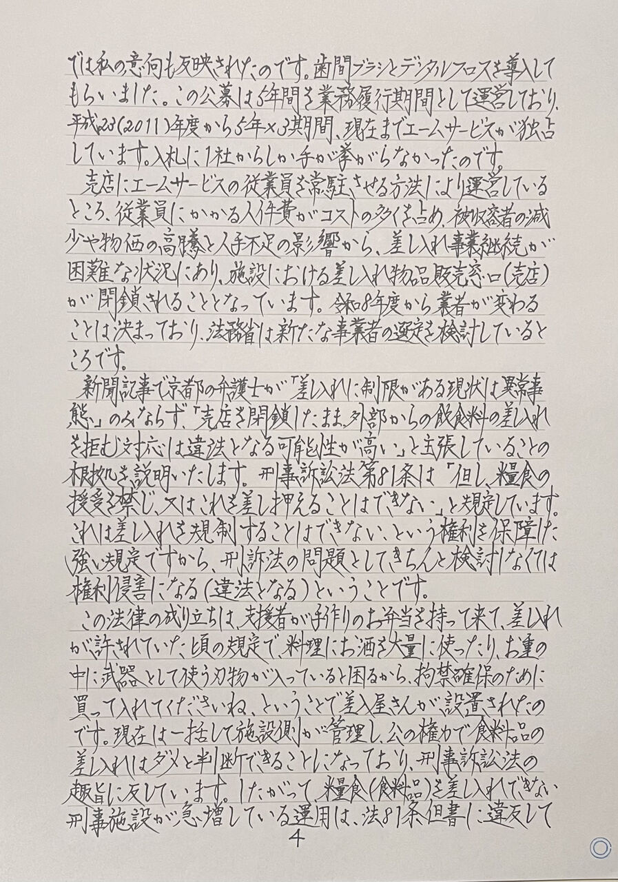 2024年9月26日、袴田巖さんが、戦後5件目の死刑再審無罪判決を言い渡されました。1966年の逮捕から袴田さんがどのような処遇で獄中生活を送っていたかを把握している弁護士はいるでしょうか。袴田さんはなぜ拘禁中に糖尿病を発症したか分かるでしょうか。受任した事件当事者の基本的人権を守るための闘いをすることは、刑事弁護人の使命です。弁護士職務基本規程にある信義誠実義と最善弁護の内実「誰がなんと言おうとあなたの味方です」というスタンスを、熱心弁護と言います。私は、刑事施設の処遇を知ることも、熱心弁護フルコースの常識になることを願っています。