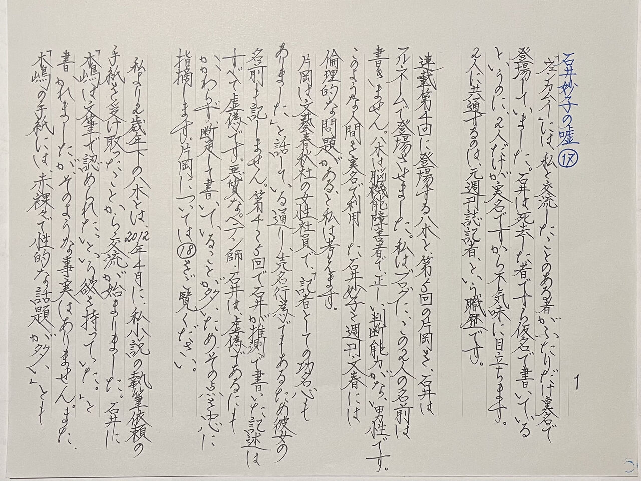 私は現在の配偶者と「取材で知り合った」と断定的に書かれましたが、事実ではありません。再婚の理由については、石井の見立ても誤りです。「創」編集長が、私の反論に一切言及しなかったことには絶望しました。私の婚姻歴については、離婚の際に交わした合意文書に秘密保持条項があるため、 現在弁護士を通して執筆(公表)の対象範囲を交渉しているところです。別離した男性と彼のご親族には、多大なご迷惑をおかけし、弁解しようもございません。彼のご多幸を、お祈り申し上げます。