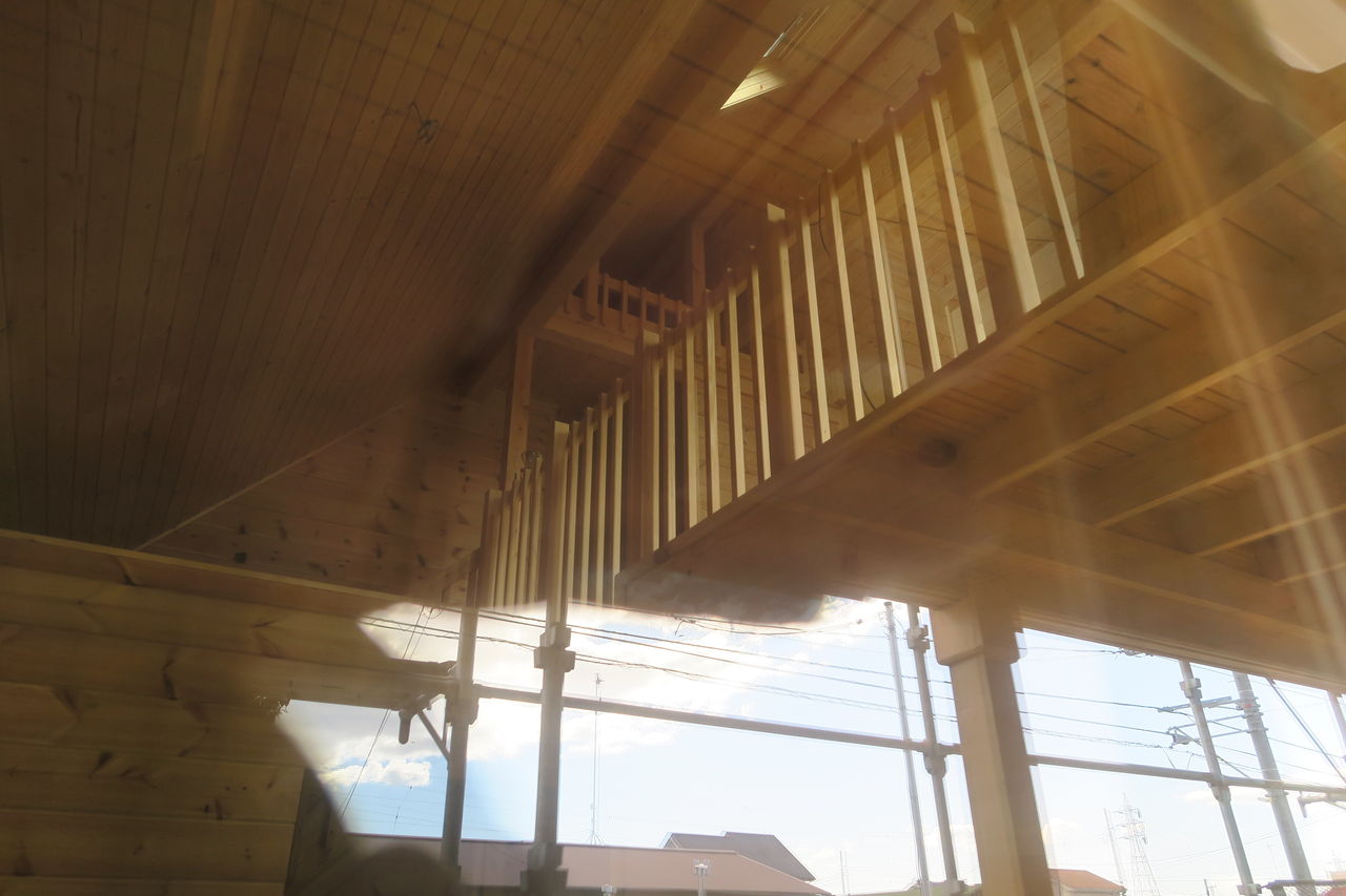 窓越しに中を覗くと2階のロフトと吹き抜けの境に手摺が出来てました。