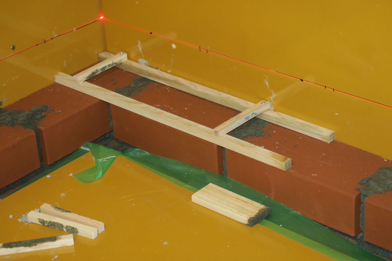 設計図では60mm×14段+10mm×13段=970mmでしたが目地隙間が大きくなってしまい60mm×13段+1.5mm×12段=960mmすなわち1段少なく14段→13段で終わることにしました。