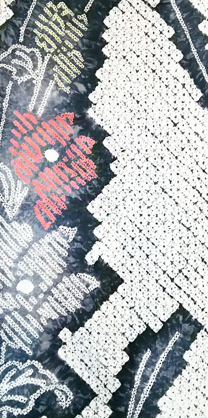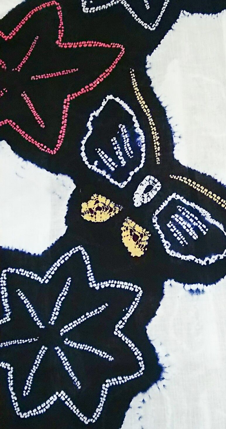・紺地に白色でお花柄の絞りにピンク色の差し色が古典的で可愛い一枚です♪
