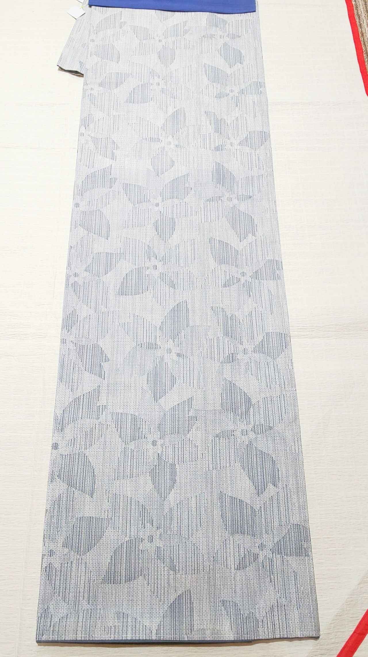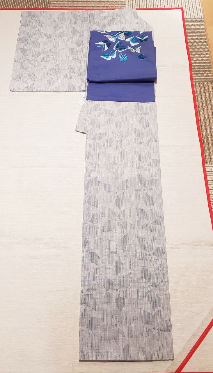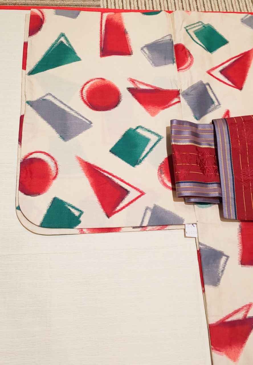 白地の紬地にグレーで亀甲と縞柄でお花のシルエットが染めてあります(*´ω`*)