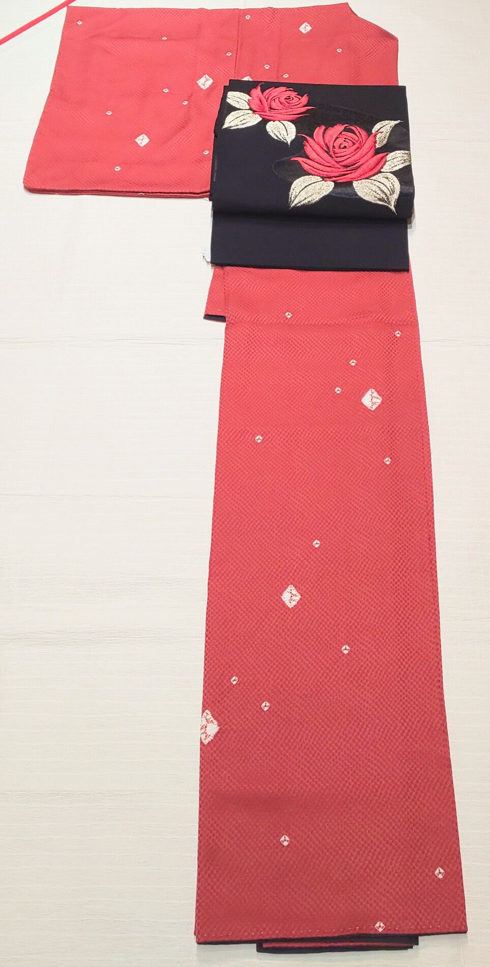 赤色に絞りの飛び柄小紋~黒地に赤薔薇の名古屋帯~です!