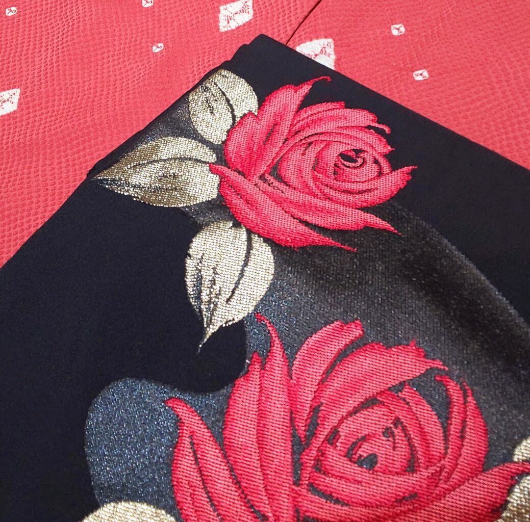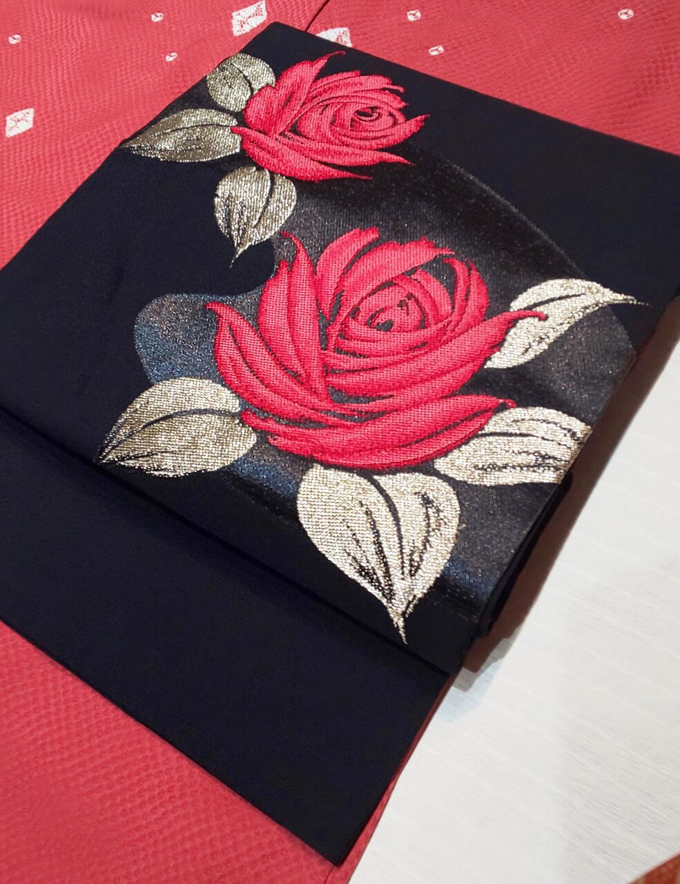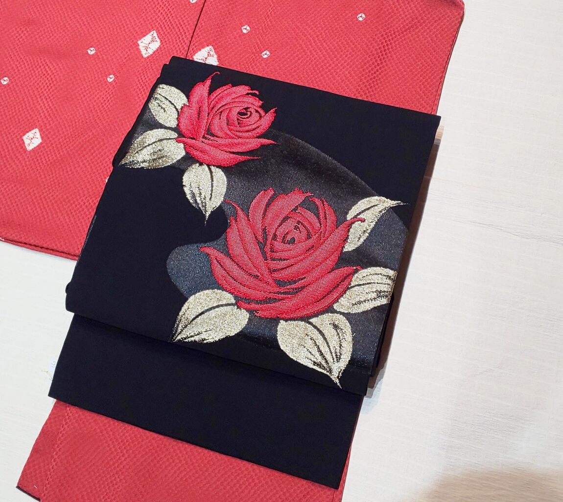 合わせたのは黒地に大輪の深紅の薔薇柄の名古屋帯!