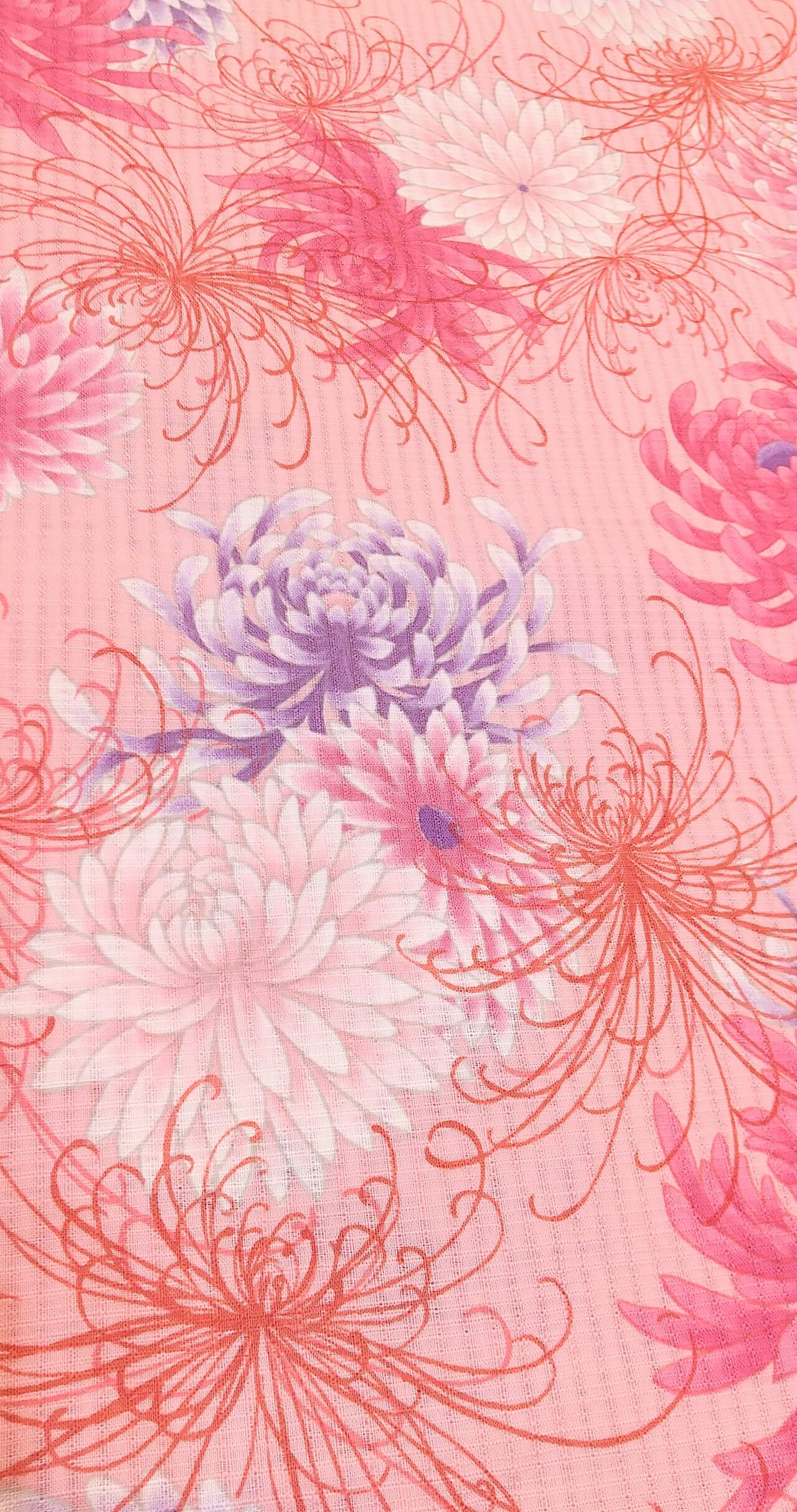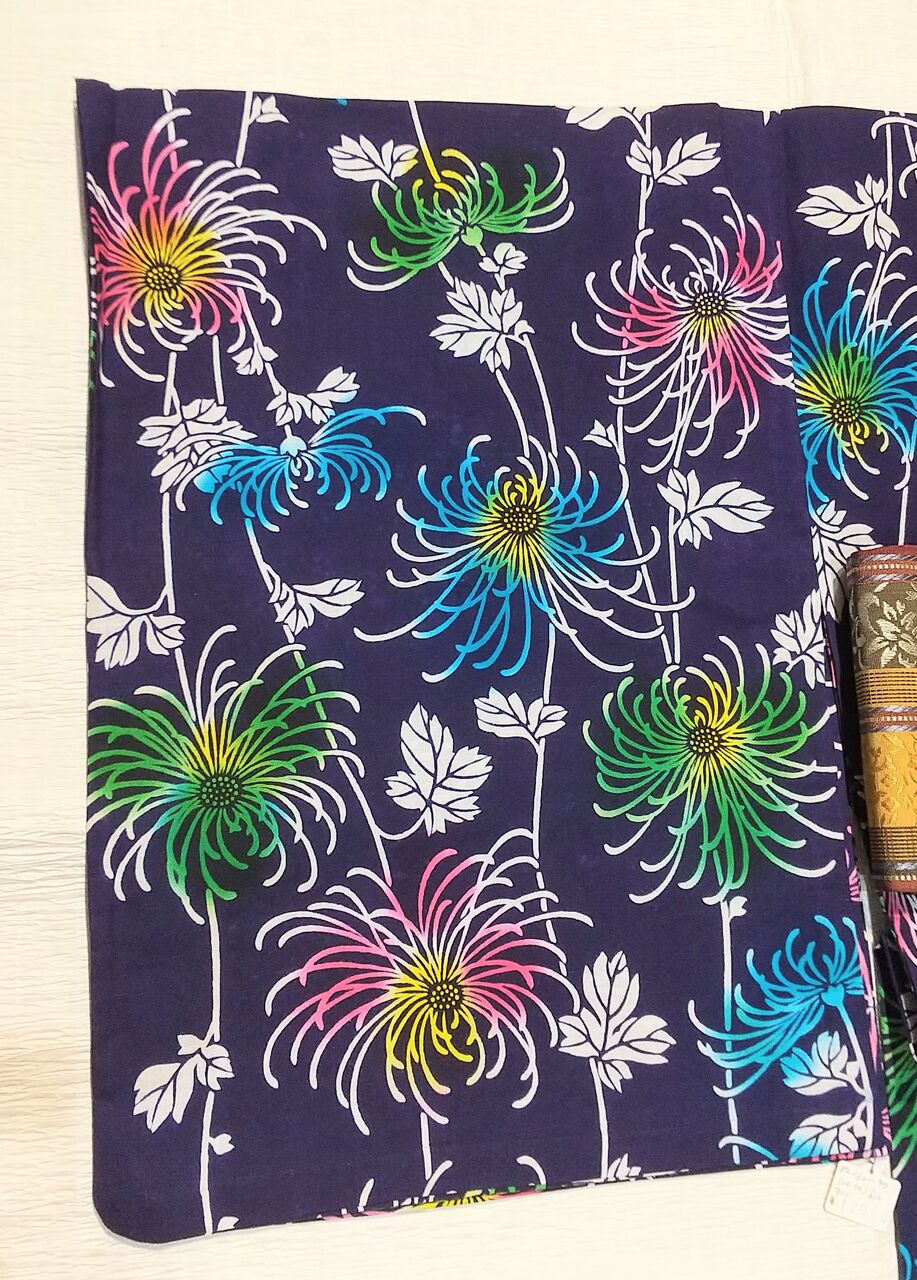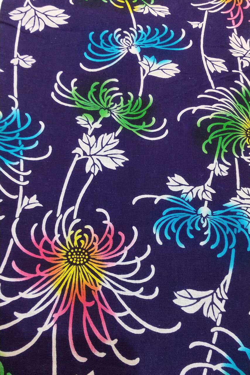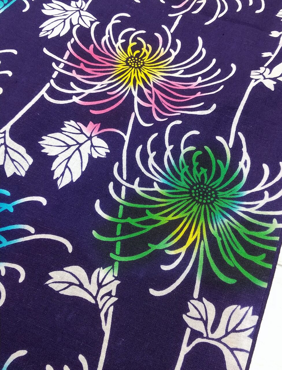 濃紺地に白色で経てに流れるように乱菊がデザインされていて、そこに注染ならではの暈しで色が差してあります✨