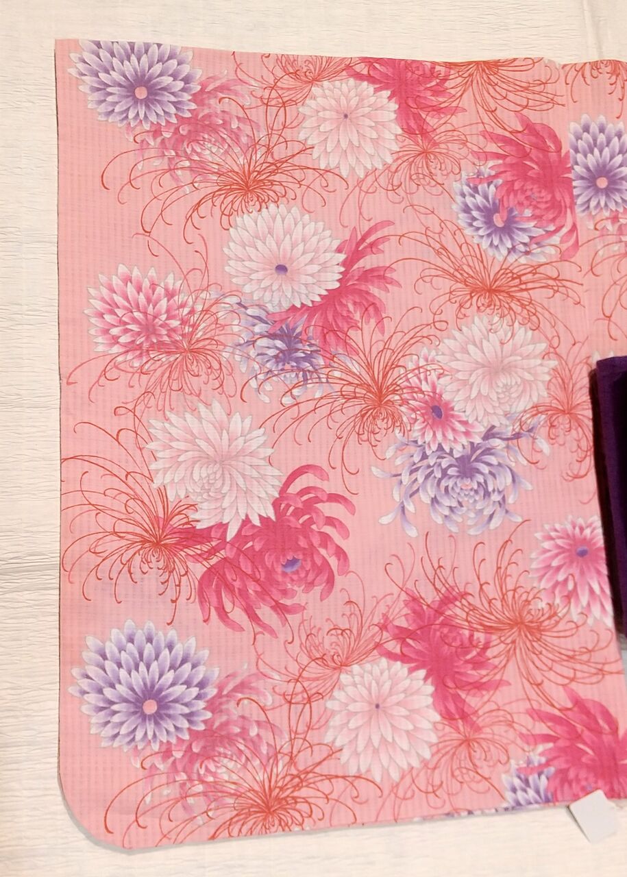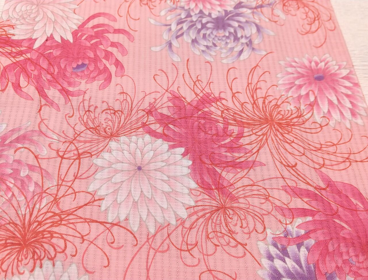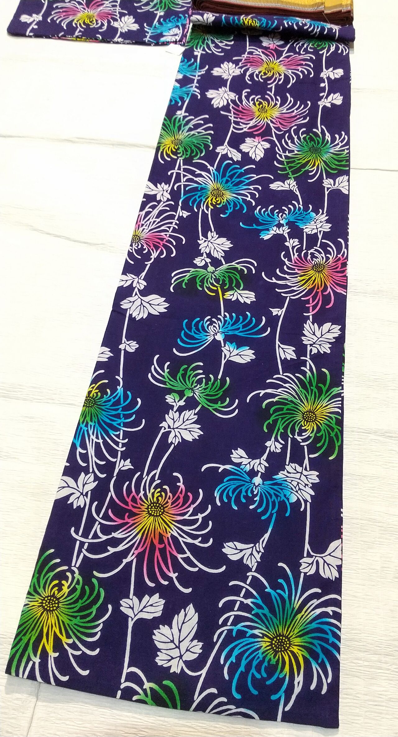 濃紺地に白色で経てに流れるように乱菊がデザインされていて、そこに注染ならではの暈しで色が差してあります✨