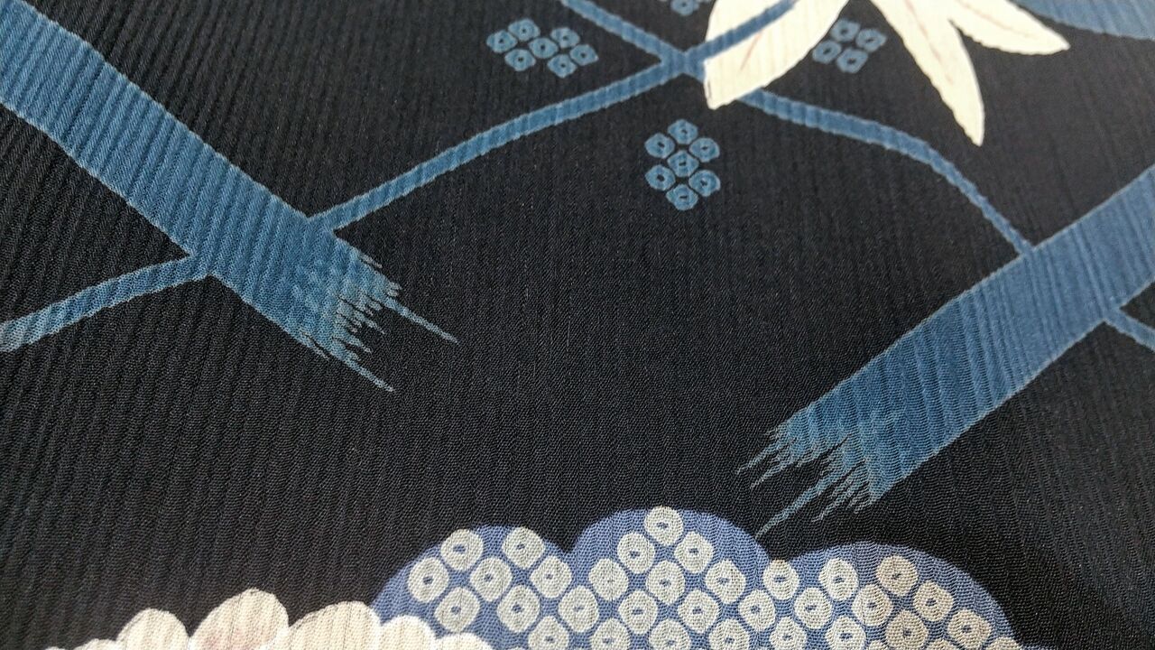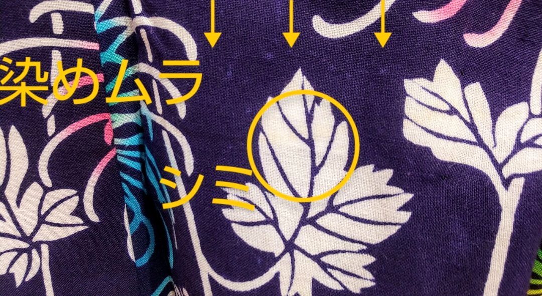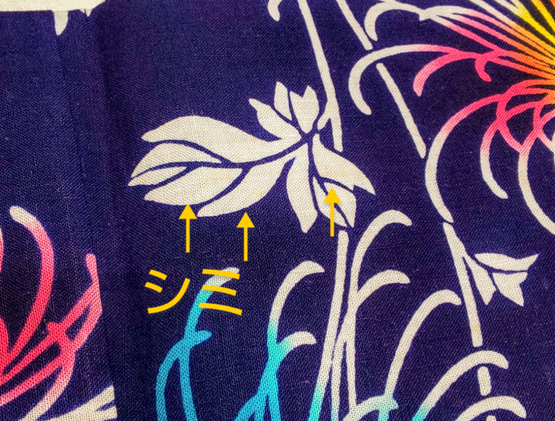 (染めムラのように濃紺が薄い部分が全体的に、糊やけが上前や肩などに少しありますが写真には上手く写らない程度です。