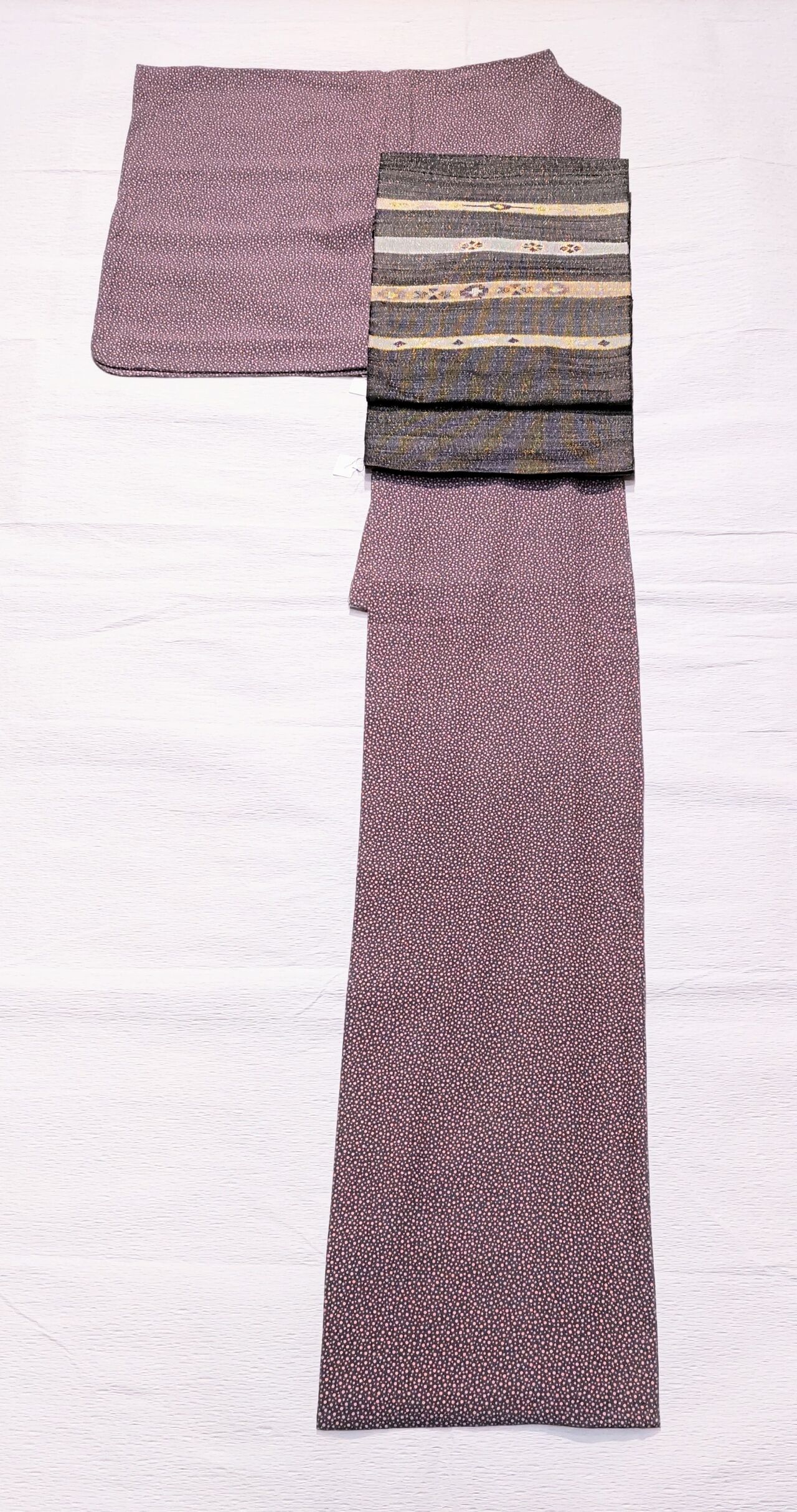 単衣 淡いブルーグレー色の小紋〜淡いオレンジ色にボーダー柄の博多織りの半幅帯〜です!