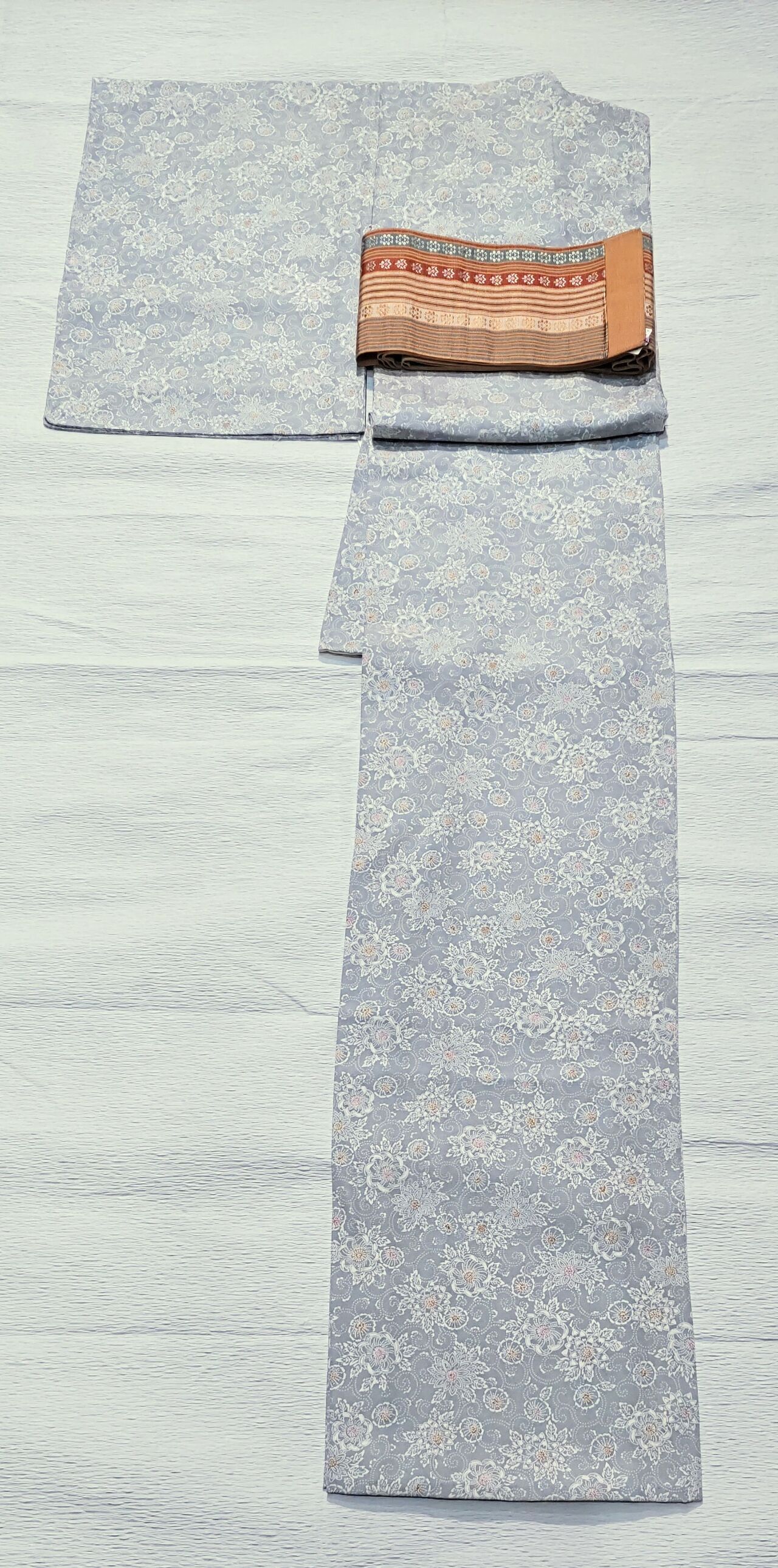 菊唐草で抽象化されていますので、合わせる帯や小物次第で残暑厳しい秋の爽やかな単衣としても、夏に向かう涼やかな春からの単衣としても、ぴったり合うコーディネートをお楽しみ頂けます◎
