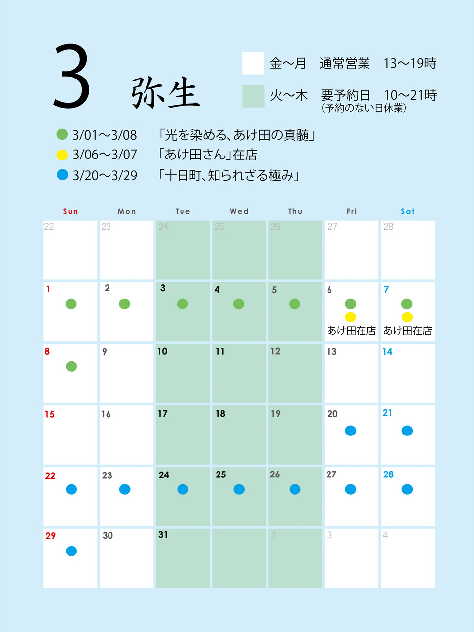 2026年3月の営業案内◾️3/1(日)~8(日)「光を染める、あけ田の真髄」〜饒舌な色彩が語る、控えめな名匠の静かなる手仕事〜3/6(金)・7(土) あけ田さん在店◾️3/20(金・祝)〜28(日)「 十日町、知られざる極み」雪国の結晶とも言える「明石縮 ...