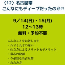 誰にも教えてもらえなかった話12「名古屋帯、こんなにもディープだったのか?!」9/14(日)・15(月)12~13時 無料・予約不要「行くよ♪」 とご連絡頂けると嬉しいです。こんなことをお話しする予定ですテーマは「名古屋帯」八寸名古屋帯と九寸名古屋帯の違 ...