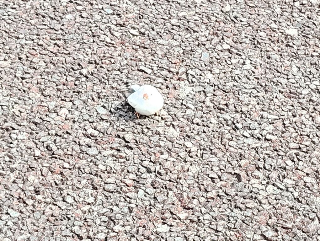 本通り6丁目の歩道で目の前に白く小さなものがよく見ると文鳥ではないですか