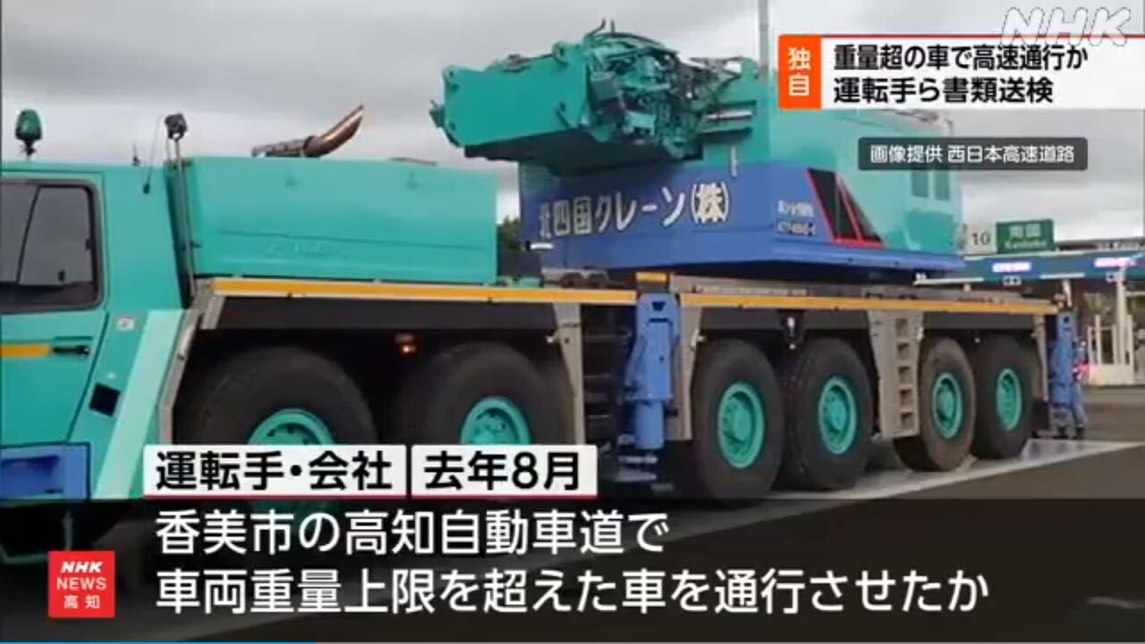 重量大幅超過の車で高速道路通行か 運転手と会社を書類送検06月19日 17時22分去年8月、高知県香美市の高速道路で、法律で定められた車両重量の上限を大幅に超えた車を通行させたとして、高松市にある建設会社の30代の運転手らが道路法違反などの疑いで19日までに書類送検されたことが捜査関係者への取材でわかりました。書類送検されたのは、高松市の建設会社、「北四国クレーン」の車を運転していた30代の運転手と、法人としての会社です。捜査関係者によりますと、去年8月、香美市の高知自動車道で、法律で定められた車両重量の上限を超えた車を通行させたとして、道路法違反などの疑いが持たれています。高速道路を通行できるのは、事前に申請して許可を得たトレーラーを除いて、総重量が25トンまでの車両などと定められていますが、この会社の車はクレーンを荷台に搭載し総重量が50トン余りだったということです。道路を管理する西日本高速道路などが行った調査で違法通行の疑いが発覚したということで、警察が告発を受けて捜査を進めてきました。警察の調べに対して運転手は「早く目的地に着きたかった」などと話し、容疑を認めているということです。会社は「社員の管理・教育ができておらず申し訳ない。安全教育を徹底し、会社一丸となって再発防止に努めたい」などとコメントしています。【西日本高速道路 取締り強化】法律で定められた重量や大きさの上限を超えて高速道路を通行する車はあとを絶ちません。西日本高速道路は7年前に四国でも専門のチームを立ち上げ取締りを強化するとともに、総重量が上限の2倍を超えるなど特に悪質な違反者については警察に告発することにしていて、2005年の民営化以降、四国で告発したのは今回のケースが初めてです。西日本高速道路によりますと、重量が超過した車は運転操作が難しくなり、重大事故を誘発するおそれがあるほか、路面に与えるダメージも大きくなり、道路の損傷につながるということです。西日本高速道路は「ドライバーや運行会社に対して法令の順守を求めるとともに、引き続き、取締りを強化したい」とコメントしています。