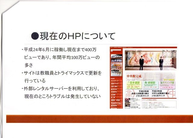 ・ 丁度、現在のホームページは「古臭い」と指摘されており、この際、新校舎・新学院神社の竣工に合わせて一新することとしました。他校と比較して特色のある素晴らしいホームページを2学期中旬頃までには開設予定で、現在のホームページの問題点であるスマートフォン・タブレット対応、法人・高校・中学の別のページが分かりにくく閲覧者が目的のページを探しにくい等を根本的に変える方向で広報情報委員会が検討を進めてくれています。その柱は「動画の多用」と聞いています。学校行事、ICT授業風景、クラブ活動等の雰囲気を動画で伝えるのが主体になるそうで、この時に「理事長・学院長の動画をメッセージ」として伝えたいと提案されています。そうしないと折角の今までのアクセス数が無駄になると言うのです。果たしてどうしたものか、私自身も考えているところです。