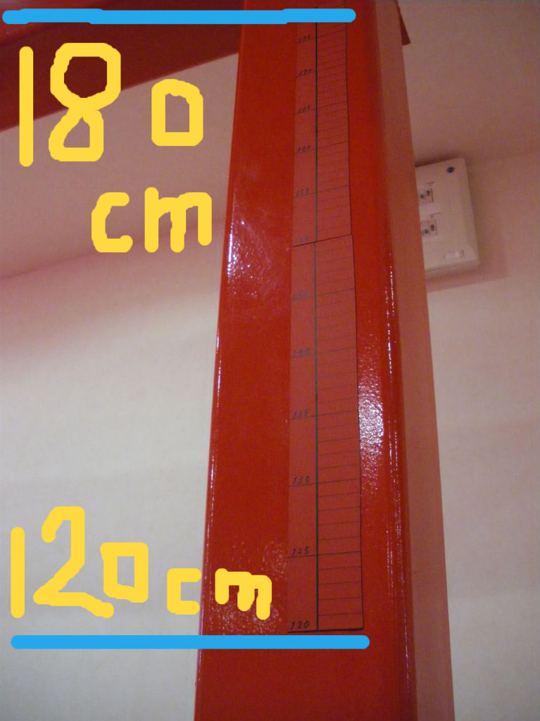 マグネットシートを用意して、メモリを書いて、サンドバックの鉄柱に貼って、手作り身長計の完成