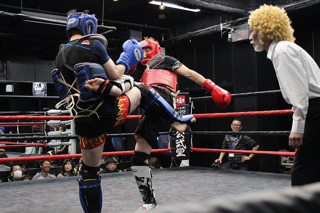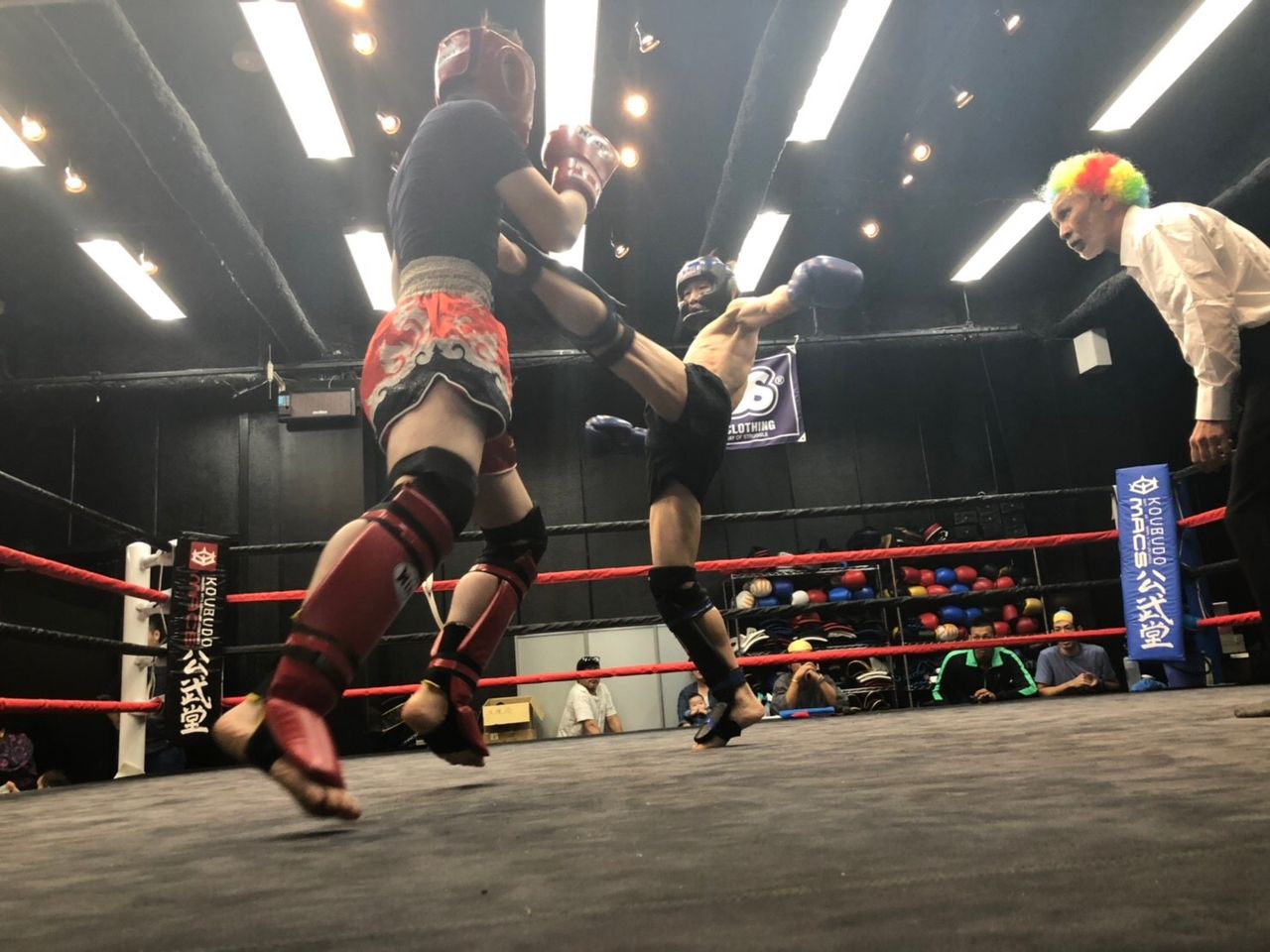 サウスポー同士は “やりにくい” となる訳です。で、こういう場合どうなるかというと双方が左ローを蹴り合うというのが典型的なパターン。ローならばその近い距離で蹴れますからね。