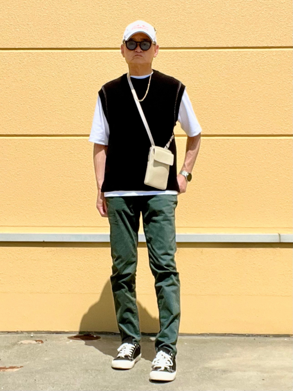 このおじさんは上半身はしっかり目で、脚はすらっと長い。首もとや胸元が窮屈に見えてしまうのでハイネックやハイウエストは似合わず勿体ないです。ジャストサイズのシンプルなシャツやジャケットに、ストレートのパンツなどを合わせたキレイ目なスタイルが似合います。