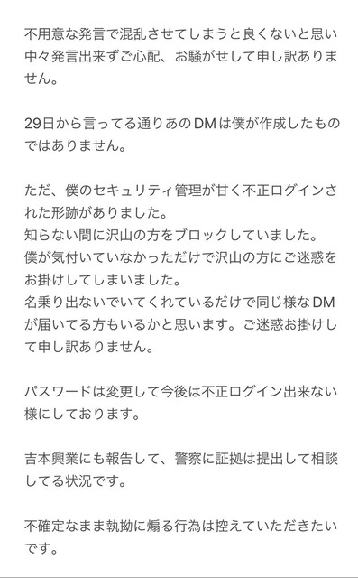 乗っ取りなら犯人が他のアカウントに誘導してやり取りしてたから自分のDM見て被害者全員確認してあれは乗っ取りだから画像とか送らないでって本人達に直接注意喚起すべきだよな