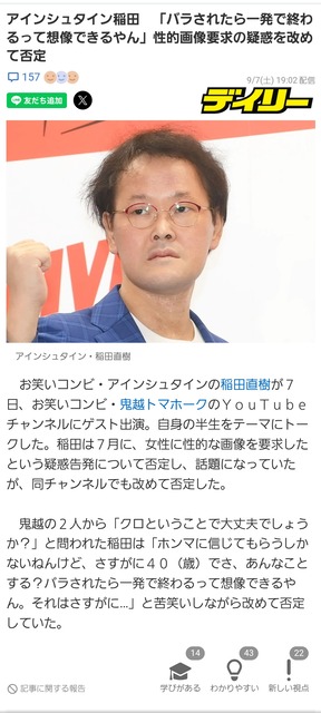アインシュタイン稲田 DM騒動に本音「風化させないって…何の正義感やねん」(東スポWEB) - Yahoo!ニュース