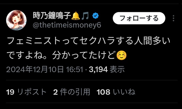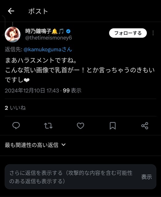 — 時乃鐘鳴子🔔🎵 (@thetimeismoney6) December 9, 2024