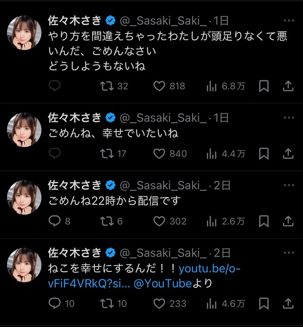 同グループのAV女優・小野六花や姉妹ユニットのAV女優・葵いぶき、未歩ななが佐々木に批判的なニュアンスでお気持ち表明