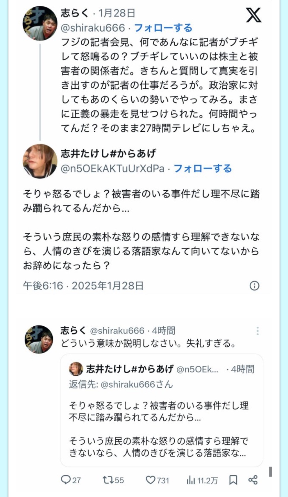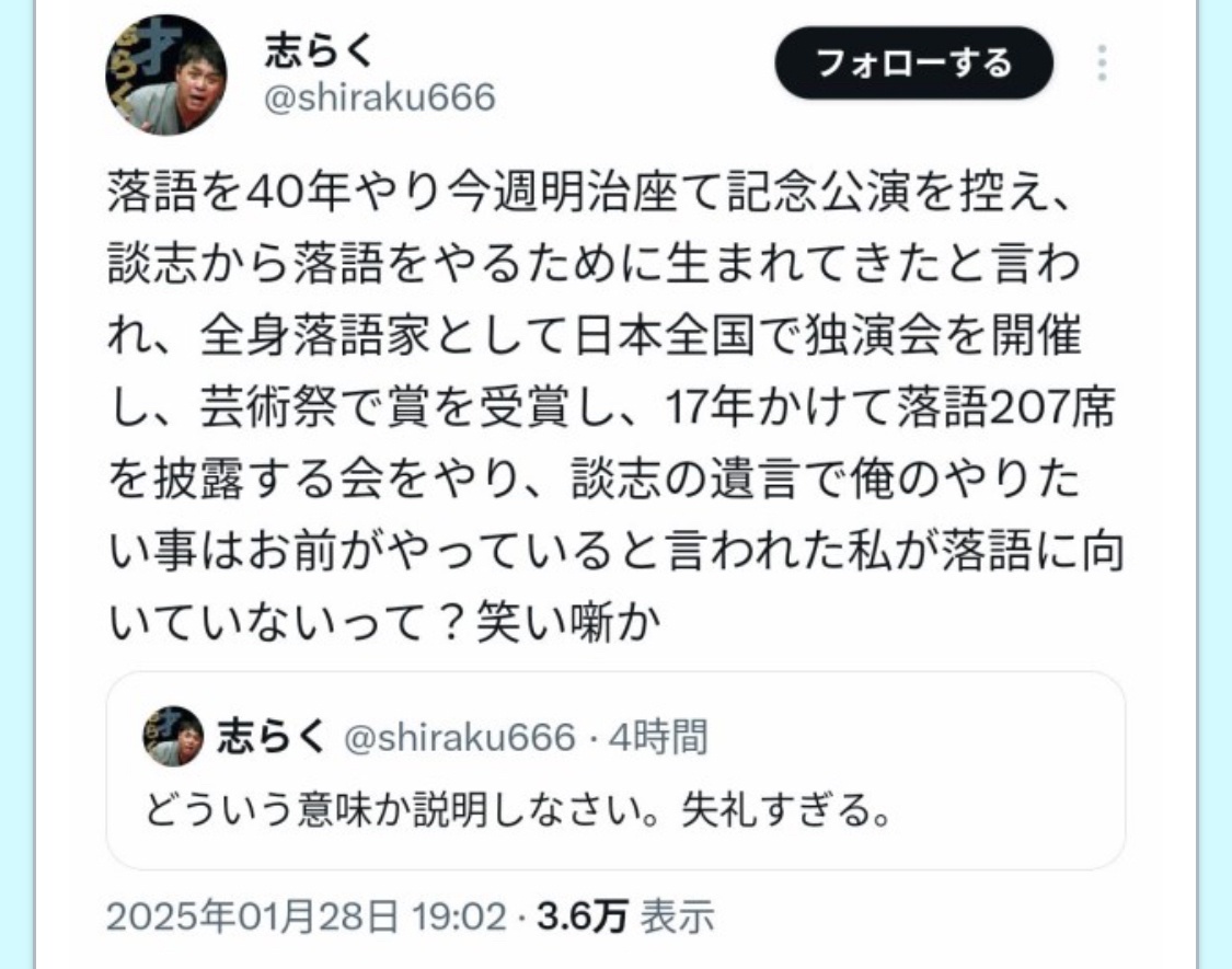 古臭い落語だけやってればいいのに大物ぶってSNSで喧嘩ですか?