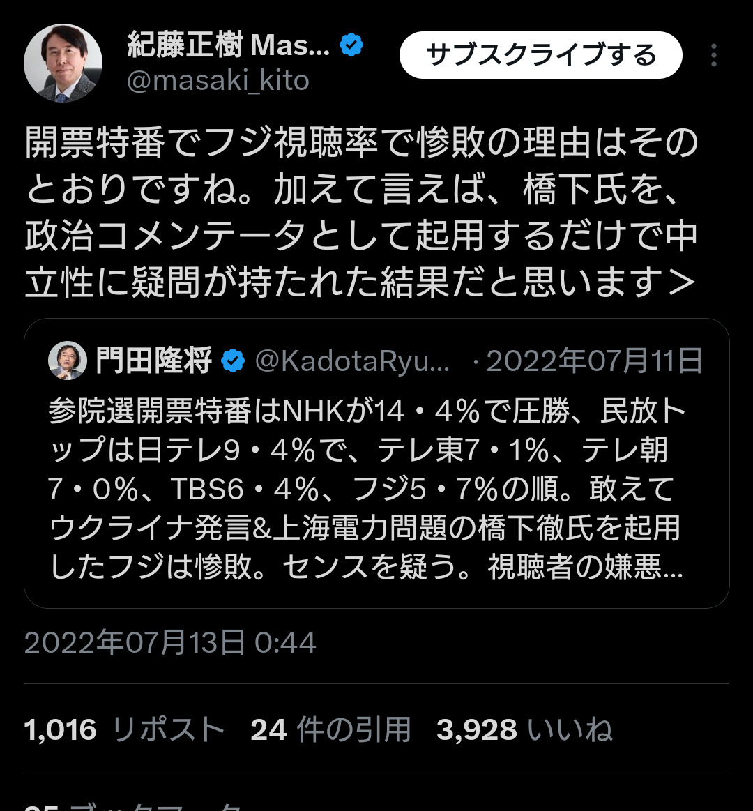 昨今の情勢見てたらフジが巻き返すことなんて殆どないのによく擁護しようと思えるよな。そんなに泥舟が好きなのか