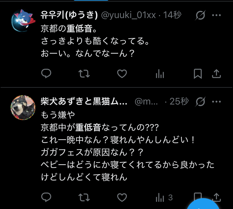 こんなド深夜に重低音の効いた音楽がうっすら聞こえ続けている。。しかも閉め切った部屋の中で。近隣のお宅かと思い周辺を歩いてきたけどどうやらもっと広範囲で響いているっぽい。山の向こうで数千人規模のロックフェスでもやってんのかというような聞こえ方。京都市。