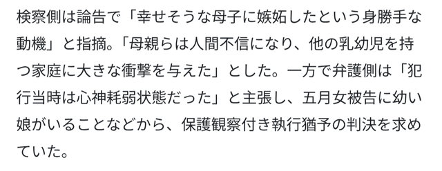 検察側は、五月女被告の動機について「子どもをたくさん産むのが夢だったが、自身は離婚しそれが難しくなった中、幸福そうな親子を見てうらやましくなった」など、強い嫉妬心にあったと指摘している。この点について、宮崎裁判官も「嫉妬心を、抵抗も被害申告もできない乳児に向けており卑劣だ」としているように、まさに身勝手極まりない犯行といえ、被告人の心情をくむことは難しい。