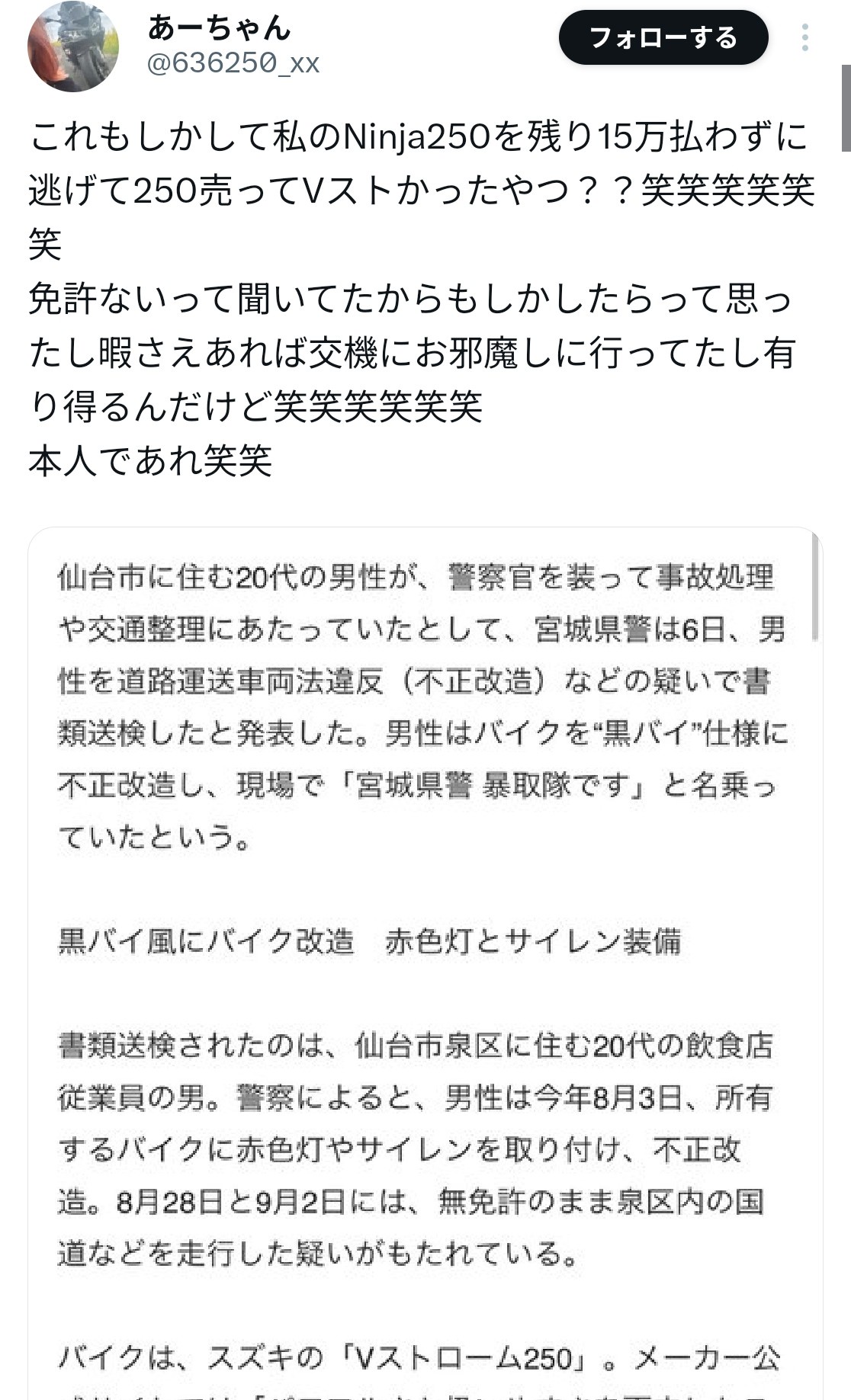 「黒バイ隊員です」実在しない宮城県警「覆面バイク」に憧れ街を“警ら”無免許偽装ライダー男を書類送検(仙台放送) - Yahoo!ニュース(中略)