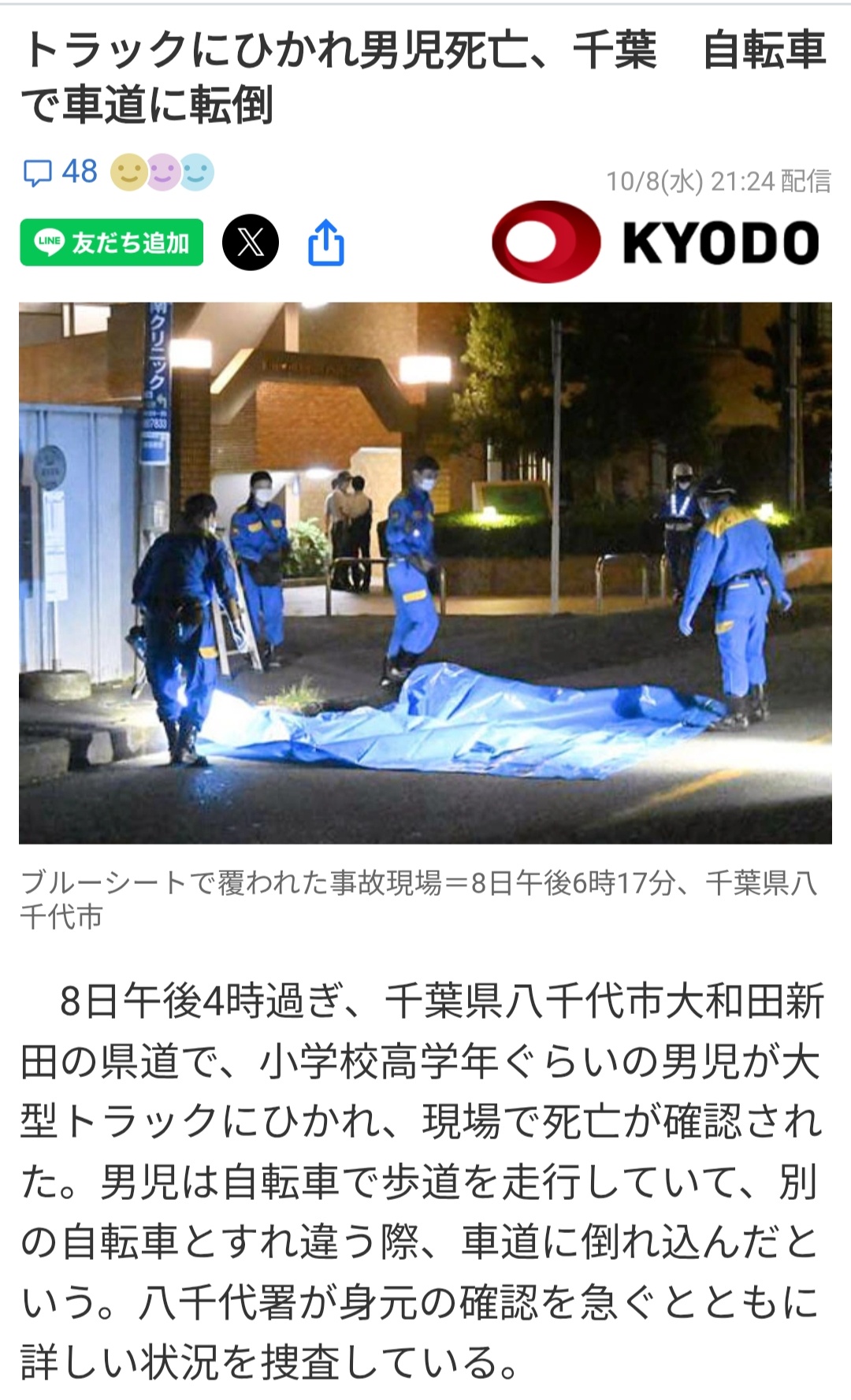 8日午後4時頃、千葉県八千代市の路上で小学校高学年とみられる男の子がトラックにひかれ、死亡する事故がありました。男の子は歩道上で自転車同士すれ違う際によけようとして、車道に倒れ込んだとみられています。