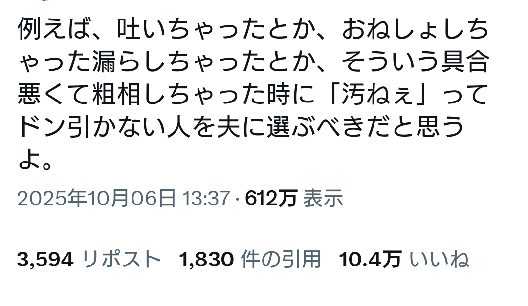 例えば、吐いちゃったとか、おねしょしちゃった漏らしちゃったとか、そういう具合悪くて粗相しちゃった時に「汚ねぇ」ってドン引かない人を夫に選ぶべきだと思うよ。