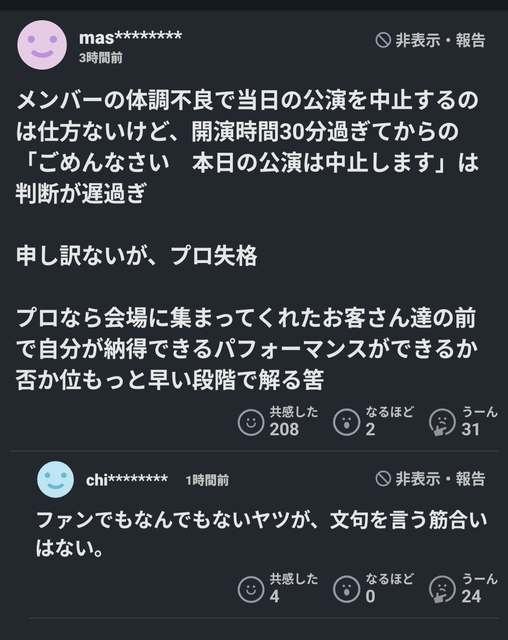 こんなもんのファンになるような奴らに同情する気にもならんけど普通こういうのは遅くても当日昼か前日に発表しろよ