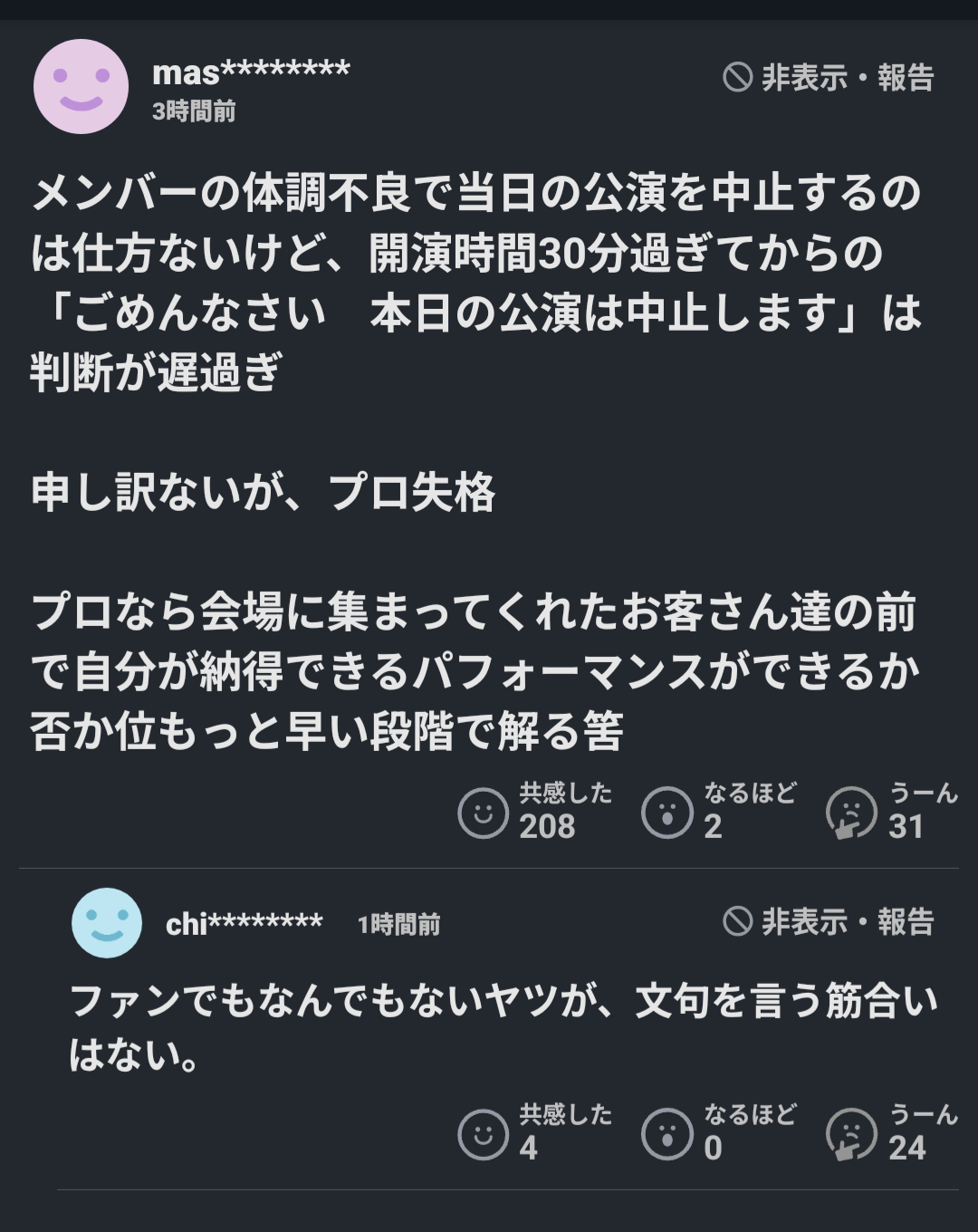 福島公演中止の発表は当日だったこともあり、SNSでも会場を訪れていたファンを中心に「開演時間から30分過ぎてたからね…何かあると思った。お大事になさってください」「早めに中止言ってほしかった」などと残念がる投稿が見られた。