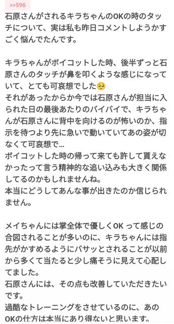 Xで「キラちゃんにだけ厳しいトレーニングさせてる、飼育員さんはメイちゃんだけに優しいのは差別だ」みたいな内容をずっと連投してる女性の人がいたね…