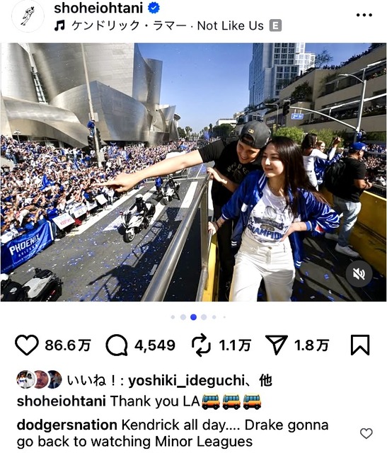 逆転優勝したドジャースのパレード、大谷がわざとドレイクを煽り返す