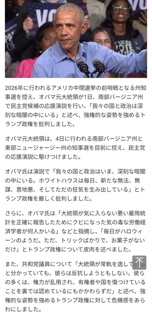 オバマの応援演説のお陰でニュージャージーとバージニアの州知事選は10%以上の大差が付いたと言われてるぐらい今回貢献してるで