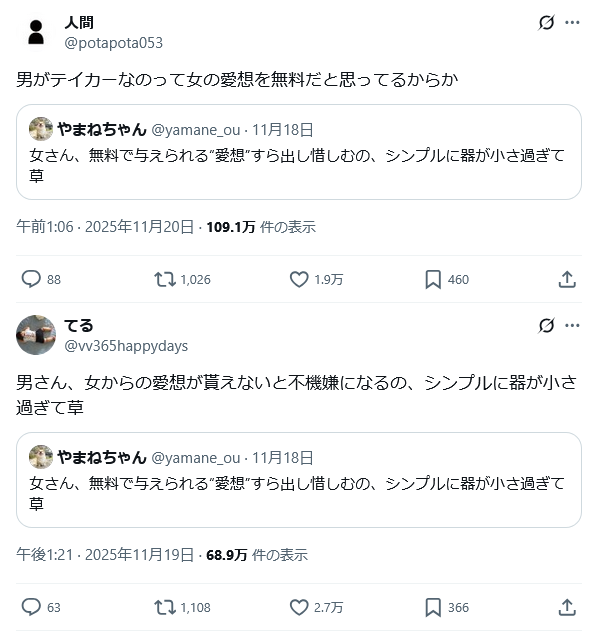 Xは女衒と独身フェミが悪魔合体した結果バケモノみたいな内容の万バズが量産されるようになった