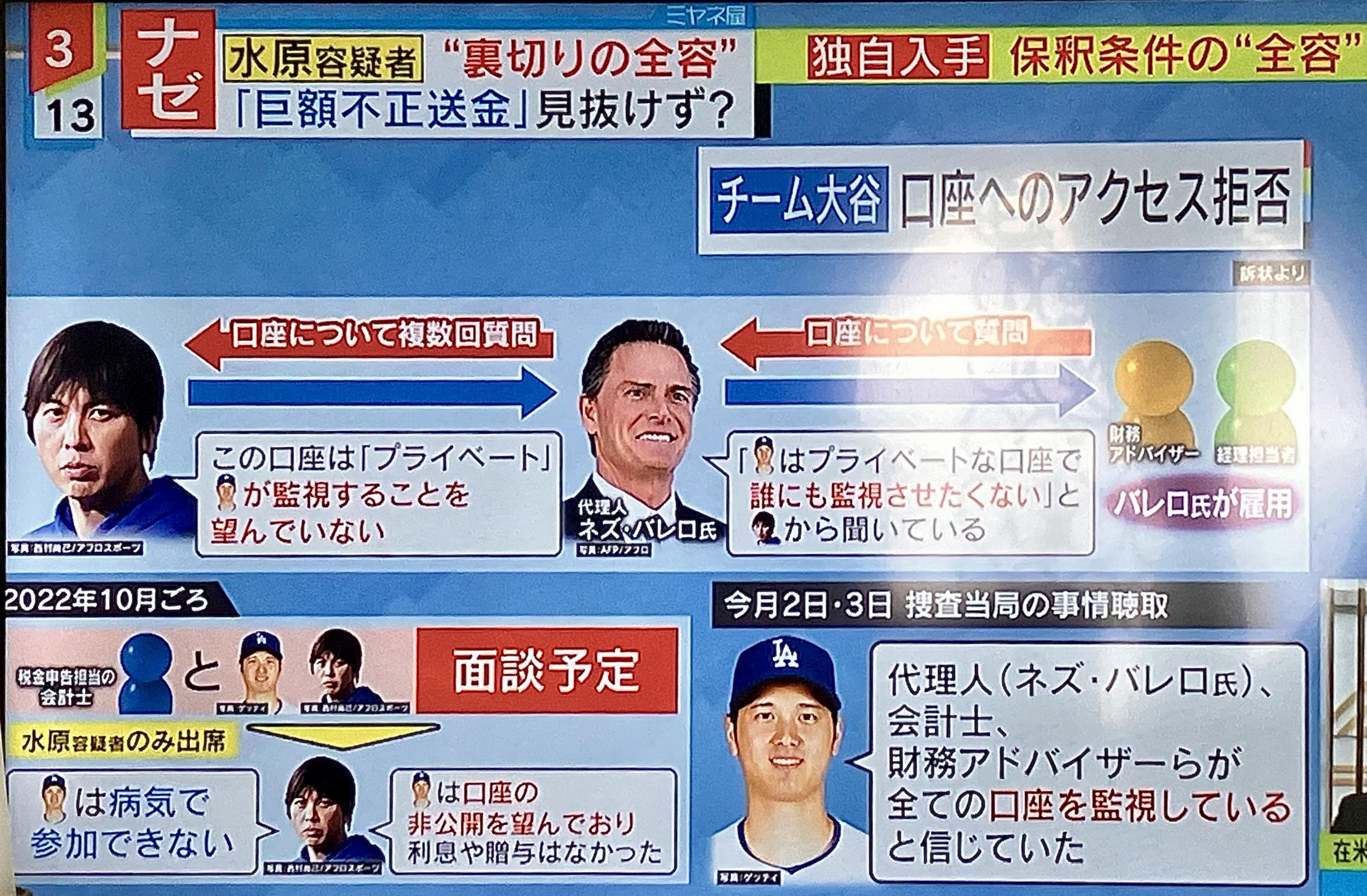 >話を聞いて資産管理に不安を持ったバレロ氏が大谷の銀行口座へのアクセスを求めたものの、その仲介人として『大谷の意思』を伝える役割をしていた水原被告は、「彼(大谷)はプライベートを保ちたいと拒否している。貴方がたを信用していない」と虚偽の通達を行った。