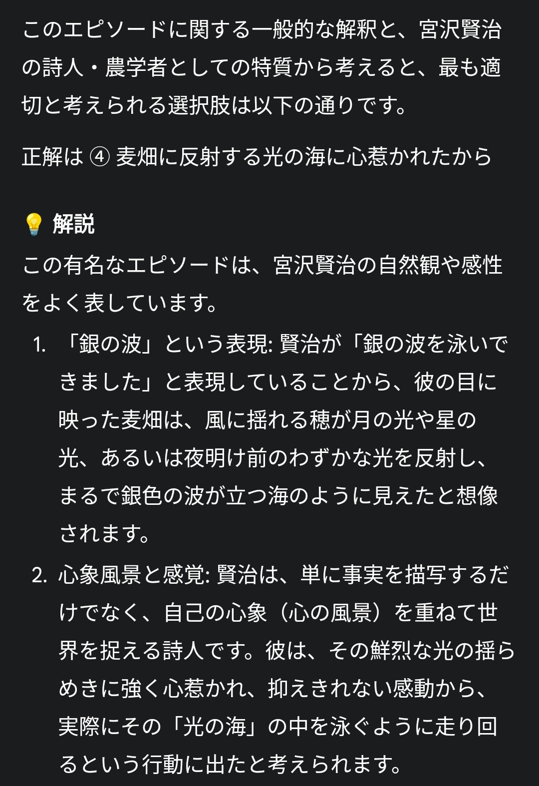 これは宮沢賢治の心情を予想する問題やなくて「銀の波」という比喩表現を正しく理解できてるかを問う問題なんや