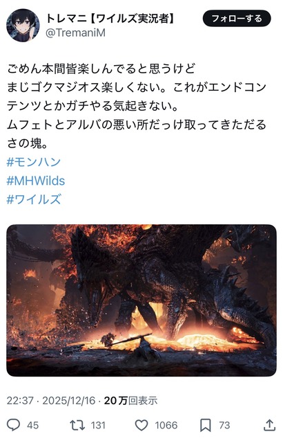ちなワイルズは2000円ぐらいなら買ってもええと思うで。アプデの節々にユーザー舐め腐ってる思考が垣間見えるだけでアクションだけはおもろい。周回せずに各モンスター数回倒して終わりでええなら2000円ぐらいの価値はある