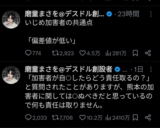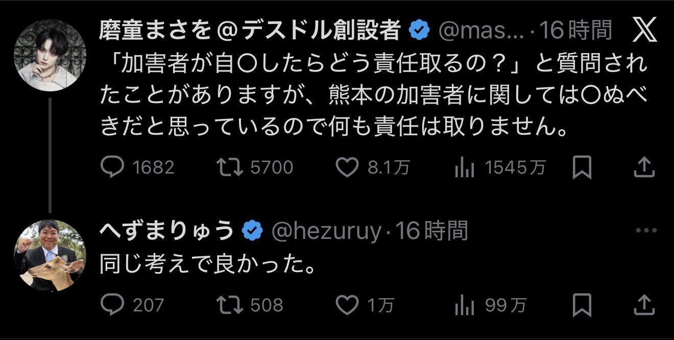 「加害者が自○したらどう責任取るの?」と質問されたことがありますが、熊本の加害者に関しては○ぬべきだと思っているので何も責任は取りません。