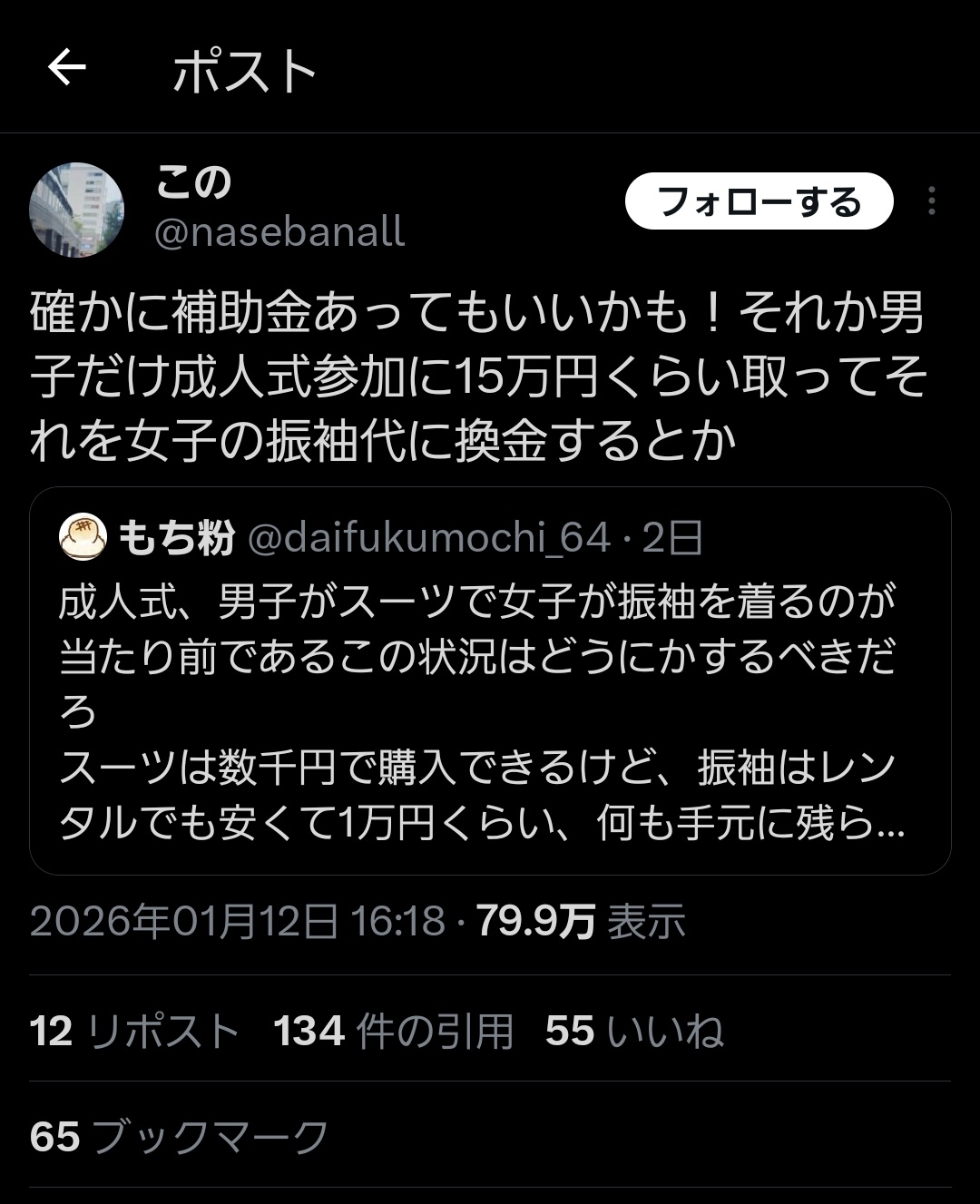 【悲報】女さん「成人式、男は安いスーツなのに女だけ高い振袖なのは不公平」