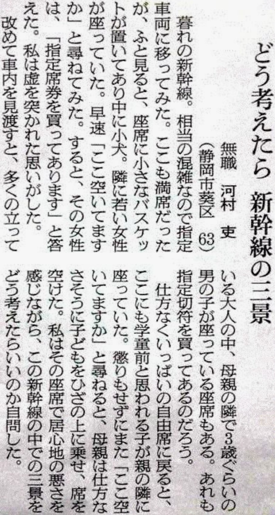 読売新聞のユーザー投稿サイト「発言小町」には、新幹線の自由席を利用したという「蕎麦粉」さんが、「新幹線の自由席を譲らされました」という不穏なタイトルのトピックを投稿しています。