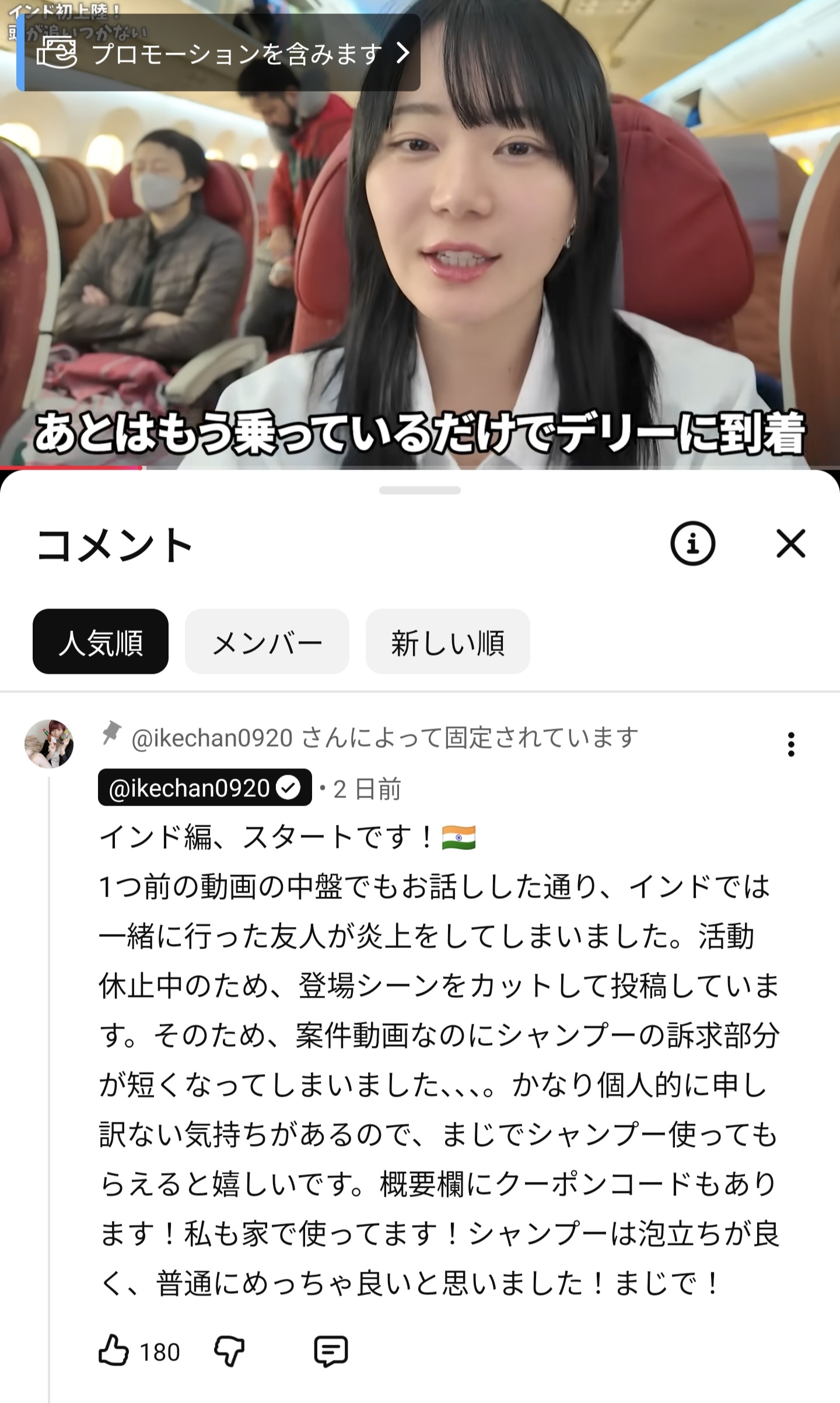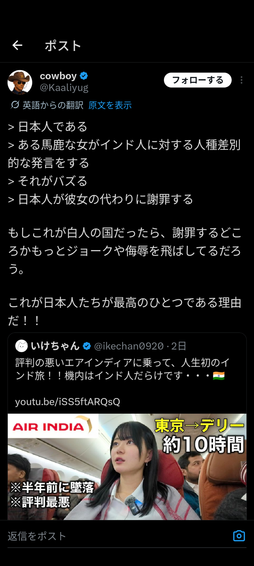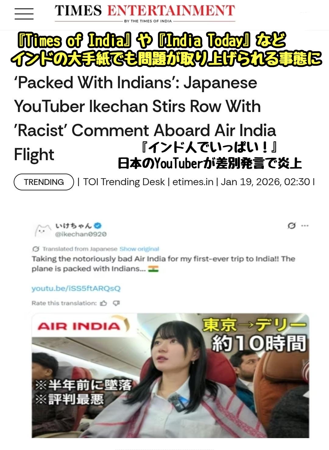 問題となったのは、1月17日に公開された「評判の悪いエアインディアに乗って、人生初のインド旅!!機内はインド人だらけです・・・」と題されたインドへの旅動画。