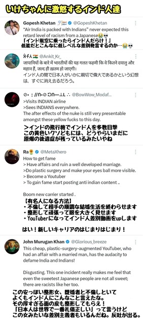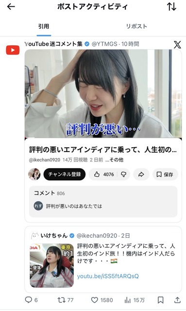 さらに「そんな航空会社使って大丈夫?」「空気汚染も最悪。間違いなく世界一汚い国」などと、インドを腐すような発言を連発。動画のサムネイルにも「※半年前に墜落」「※評判最悪」といった、不幸な事故を揶揄するような過激な文言が躍っていた。