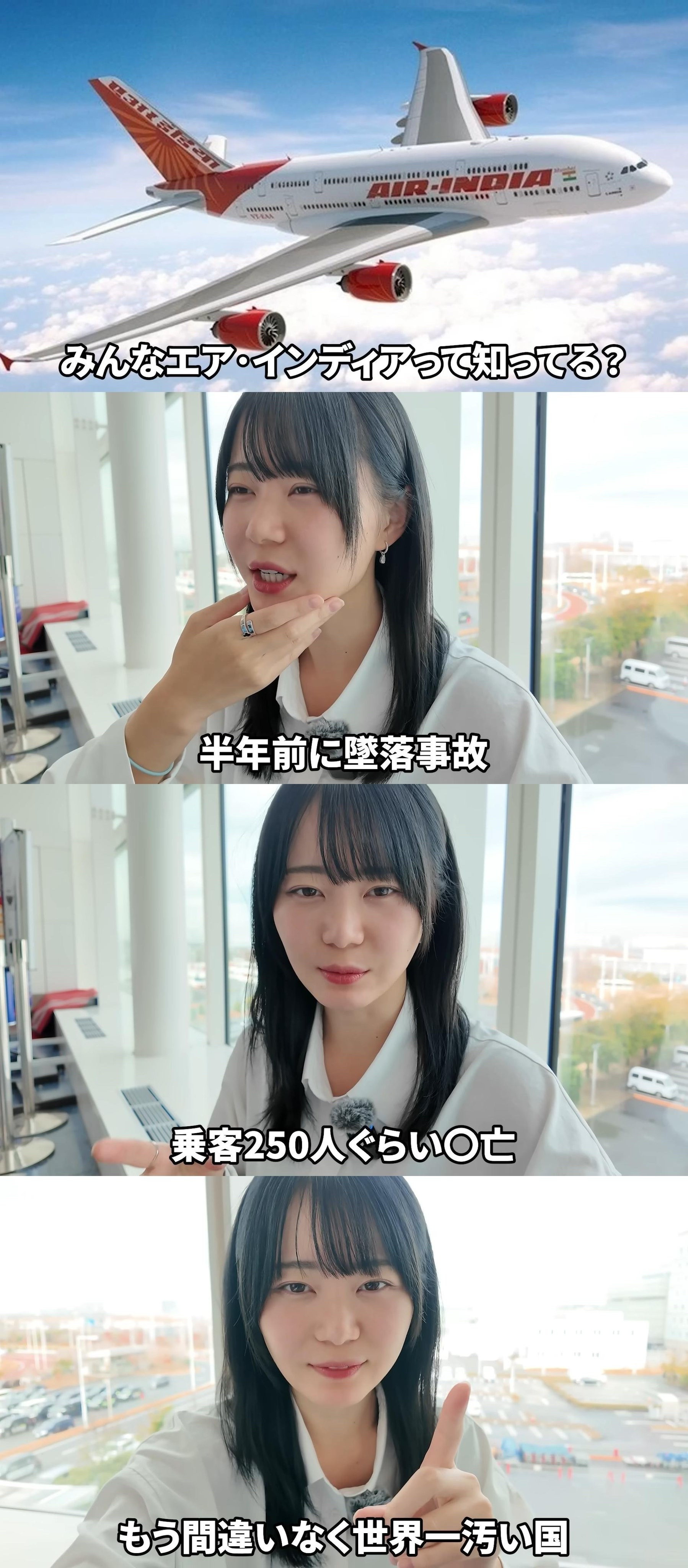 羽田空港からインドに向かういけちゃんは、動画冒頭でいきなり「みんな、エアインディアって知ってる? これね〜、評判悪いんです」と航空会社の酷評からスタート。昨年6月に発生したエア・インディア171便の墜落事故を持ち出し、テロップで「乗客250人くらい◯亡(編集部注:実際は260人 )」と表記した。