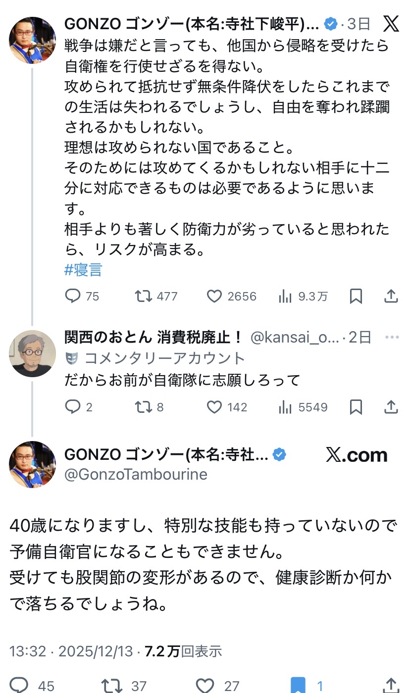 何より徴兵制に賛同するなら今の仕事止めてさっさと自衛隊行けよな